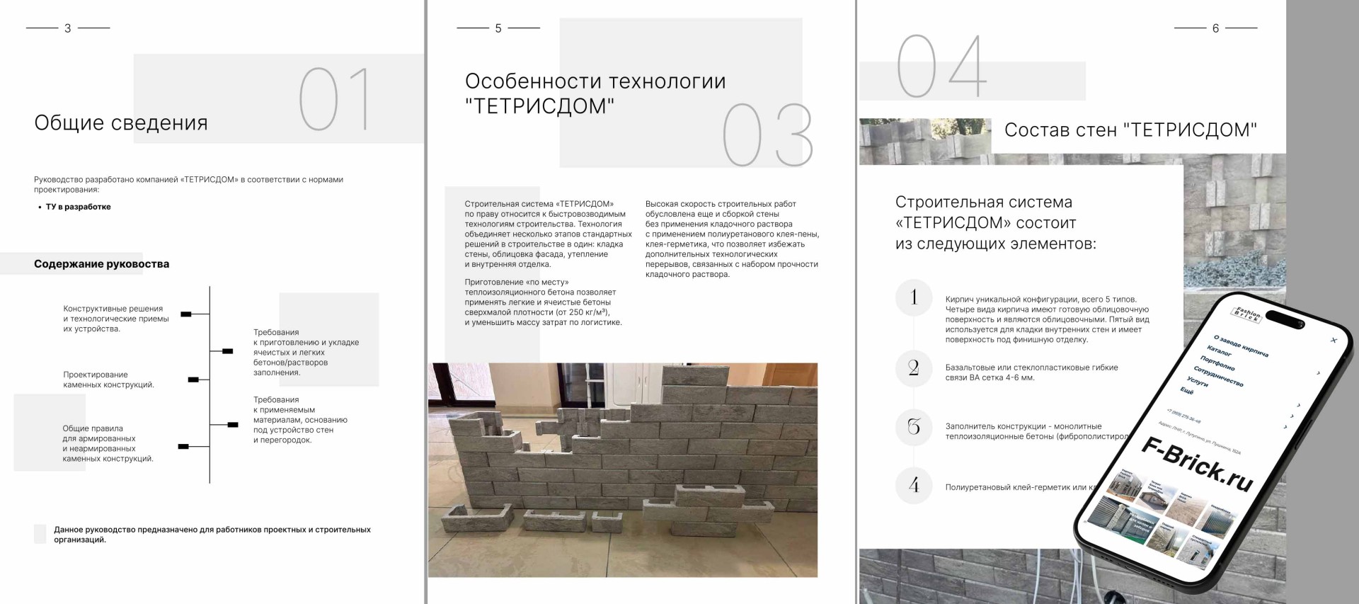 Система «ТЕТРИСДОМ» включает в себя кирпичи уникальной конфигурации, всего 5 типов. Четыре из них являются облицовочными и имеют готовую облицовочную поверхность, что позволяет значительно сократить время на отделочные работы. Пятый тип кирпича предназначен для кладки внутренних стен и имеет поверхность, готовую к финишной отделке. Это обеспечивает высокую степень готовности стен и упрощает процесс строительства.