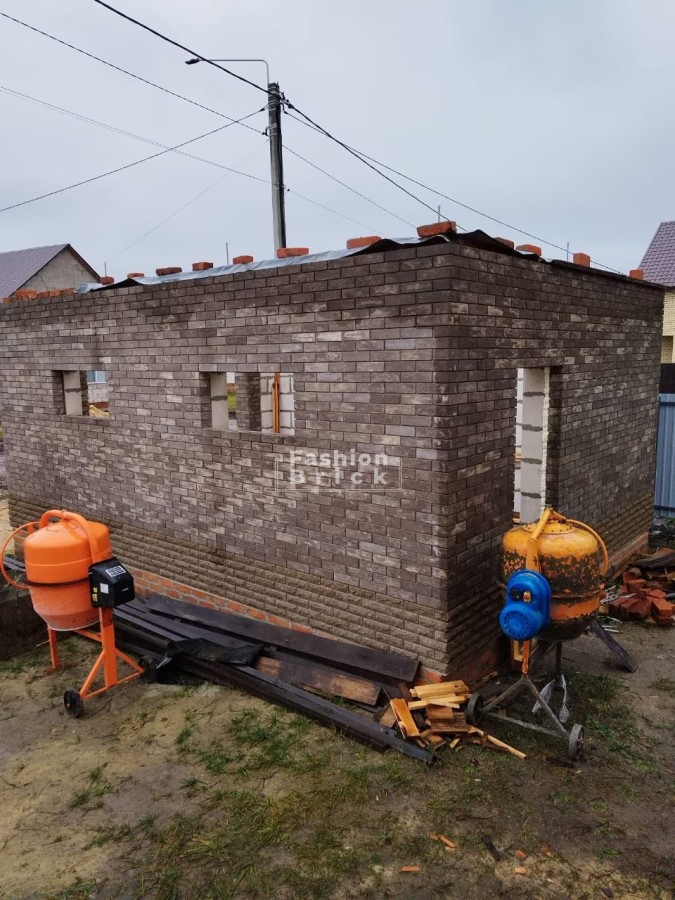 мФотографии строительства дома из гладкого серого кирпича «Амстердам» от завода Fashion Brick демонстрируют высокое качество материалов и современный подход к возведению жилого здания. В рамках проекта ведется строительство фасадных стен, колонн, столбов и опор, что обеспечивает прочность и эстетическую привлекательность конструкции.