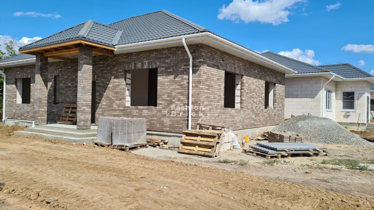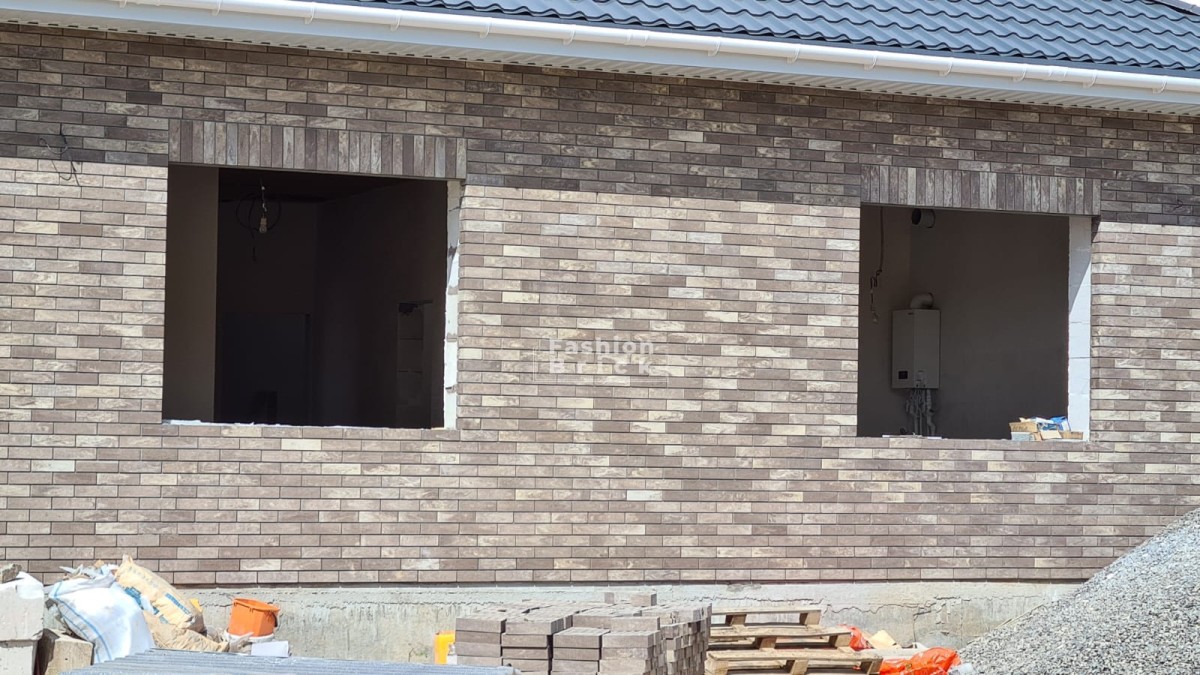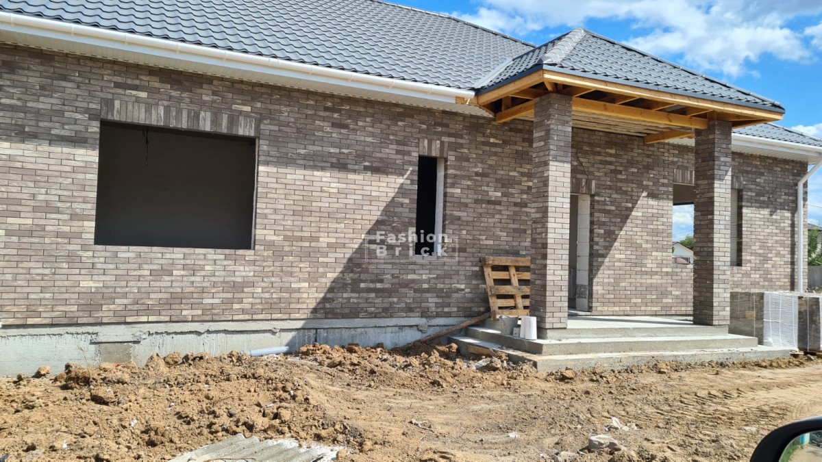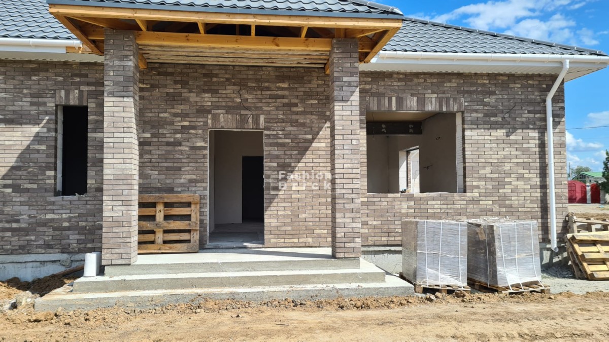 Фотографии строительства дома в Астрахани демонстрируют высокое качество и современный дизайн, достигнутые благодаря использованию облицовочного кирпича «Амстердам» гладкой текстуры от завода Fashion Brick. В рамках проекта ведется возведение фасадных стен и колонн, которые облицованы данным кирпичом, что придает зданию стильный и аккуратный внешний вид.