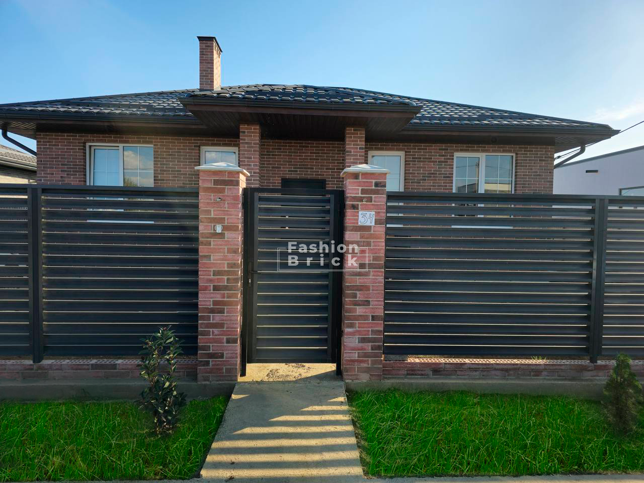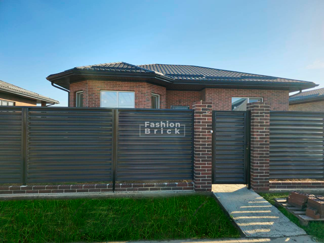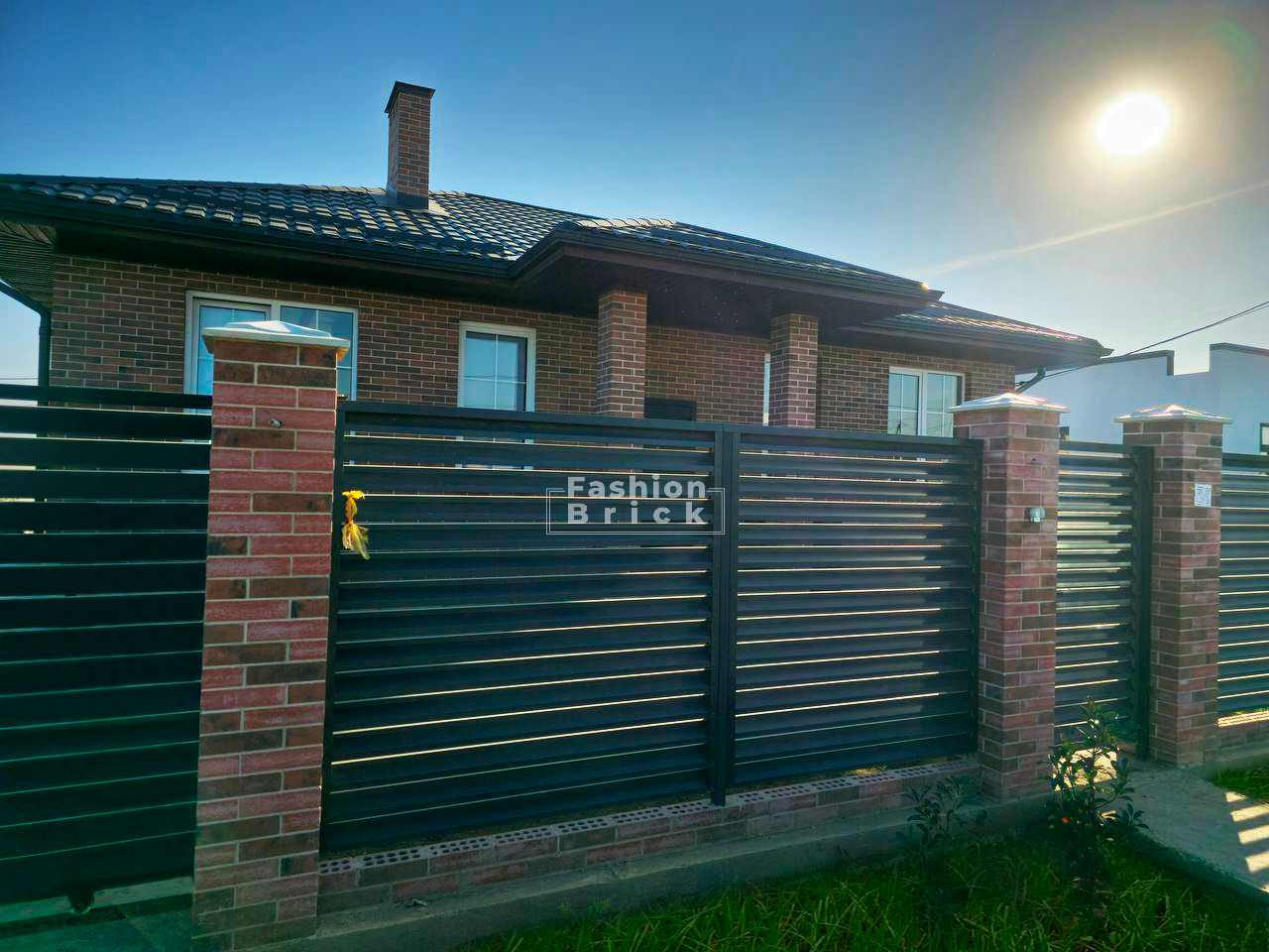 Фотографии построенного готового забора из кирпича «Мюнхен» от завода Fashion Brick наглядно демонстрируют высокое качество исполнения и продуманный архитектурный дизайн. На снимках отчетливо видны аккуратно выложенные кирпичные блоки и колонны забора, а также заборные секции и опоры, которые гармонично сочетаются между собой, создавая надежное и эстетически привлекательное ограждение.